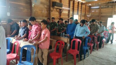 Anggota TMMD beribadah bersama masyarakat setempat, dalam kegiatan ibadah ini Satgas TMMD Ke 115 Kodim 0313/KPR mengambil ” Topik : Tuhan Menjawab Segala Doa dan Pergumulan “.