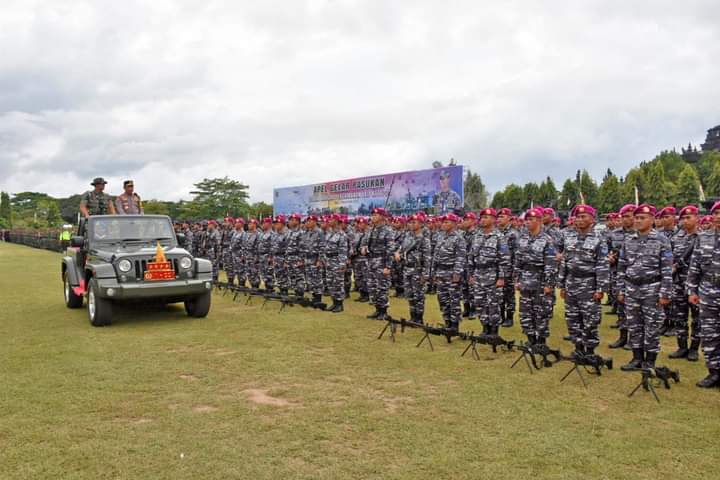 Dalam rangka mengecek kesiapan pengamanan VVIP Presidensi KTT G20, Prajurit Batalyon Infanteri 5 Marinir mengikuti apel gelar kesiapan Pasukan di lapangan Niti Mandala Renon, Denpasar, Bali, Senin (07/11/2022).