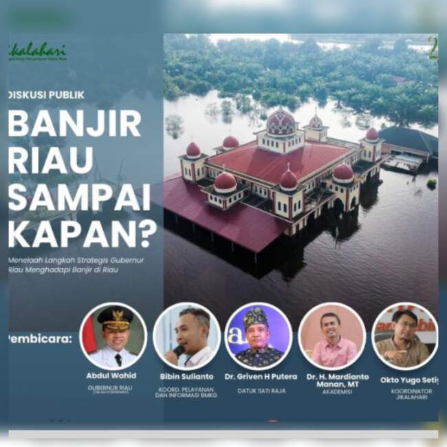 Banjir di Riau kembali menjadi sorotan dalam Diskusi Publik bertajuk “Banjir Riau Sampai Kapan?” yang digelar oleh Jaringan Kerja Penyelamat Hutan Riau (Jikalahari). Bertempat di Sekretariat Jikalahari, Jalan Kamboja No. 39, Pekanbaru, diskusi ini menghadirkan berbagai pemangku kepentingan, termasuk akademisi, aktivis lingkungan, tokoh adat, serta perwakilan pemerintah.