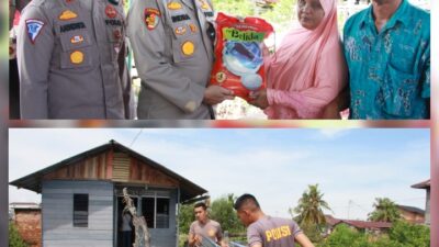 Kapolres Bengkalis pada kesempatannya memberikan Bantuan sembako kepada warga yang rumahnya akan diperbaiki.