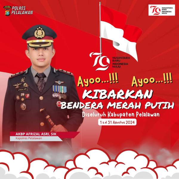 Kepala Kepolisian Resor (Kapolres) Pelalawan Polda Riau, AKBP Afrizal Asri SIK, mengimbau seluruh lapisan masyarakat Kabupaten Pelalawan untuk berpartisipasi dalam merayakan Hari Ulang Tahun Kemerdekaan Republik Indonesia ke-79 dengan mengibarkan bendera merah putih di halaman rumah, sekolah, dan kantor masing-masing dari tanggal 1 hingga 31 Agustus 2024.