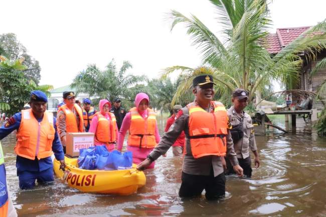 Kapolres Pelalawan bersama Ketua Cabang Bhayangkari Pelalawan tinjau dan berikan bantuan kepada Puluhan keluarga di Dusun Muara Sako Kecamatan langgam yang terendam luapan air Sungai Kampar pada Selasa, Selasa (12/12/ 2023)