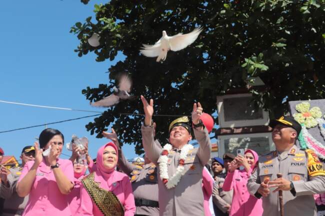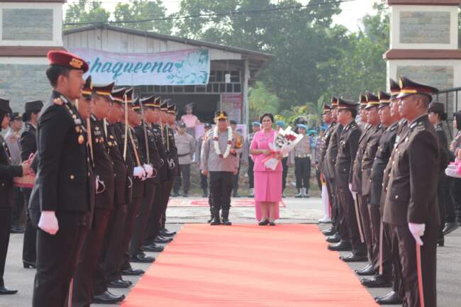 Rangkaian acara diawali dengan prosesi penyambutan dan pedang pora, sebagai bentuk penghormatan kepada Kapolres baru, AKBP John Louis Letedara, SH, SIK, MH. Suasana haru dan khidmat terasa kuat, mencerminkan transisi kepemimpinan yang penuh rasa hormat dan kebersamaan.
