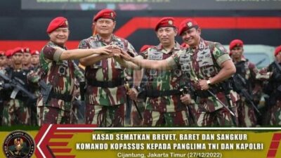 Kepala Staf Angkatan Darat (Kasad) Jenderal TNI Dr. Dudung Abdurachman didampingi Danjen Kopassus Mayjen TNI Iwan Setiawan, menyematkan brevet kehormatan Kopassus, baret, serta sangkur Komando kepada Panglima TNI Laksamana TNI Yudo Margono, S.E., M.M., C.S.F.A. dan Kapolri Jenderal Pol. Drs. Listyo Sigit Prabowo, M.Si., di Makopassus Cijantung, Jakarta Timur. Selasa, (27/12/2022).