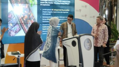 Direktur APR Basrie Kamba secara simbolis memberikan scarf tersebut kepada Ketua Dharma Wanita Persatuan Kemenparekraf Nur Asia Sandiaga Uno yang disaksikan oleh Menteri Pariwisata dan Ekonomi Kreatif Sandiaga Uno, di Gedung Kemenparekraf, Senin (19/09/2022), Jakarta.