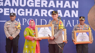 Penyerahan penghargaan tersebut, diserahkan langsung oleh Kapolda Riau Irjen Pol Mohammad Iqbal dan disaksikan oleh Gubernur Riau H. Syamsuar beserta Forkopimda di lingkungan Provinsi Riau, di Halaman Mapolda Riau, Pekanbaru, Kamis (29/12/22) di Pekanbaru.