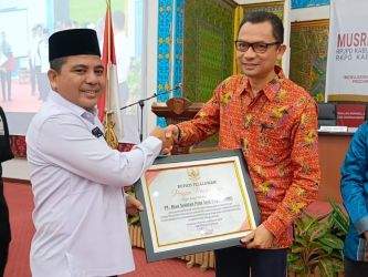 Penghargaan diserahkan oleh Wakil Bupati Pelalawan Nasaruddin dan diterima langsung oleh Community Development (CD) Head RAPP F Leohansen Simatupang, saat Musyawarah Perencanaan Pembangunan (Musrenbang) Rencana Pembangunan Jangka Panjang Daerah (RPJPD) tahun 2025-2045 dan Rencana Kerja Perangkat Daerah (RKPD) tahun 2025 Kabupaten Pelalawan, Kamis (28/3/2024) di Gedung Daerah Datuk Laksamana Mangkudiraja Pelalawan.
