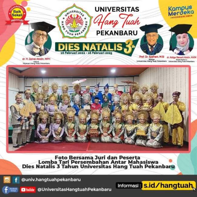Tepatnya 16 Februari 2025 Universitas Hang Tuah Pekanbaru merayakan Sempena Dies Natalis ke 3 tahun, kali ini pihak universitas dengan sengaja mengangkat thema “Bersinergi Mewujudkan Kampus yang Inovatif, Responsif, dan Kreatif di Bidang Teknologi, Kesehatan, Hukum, dan Komunikasi”.